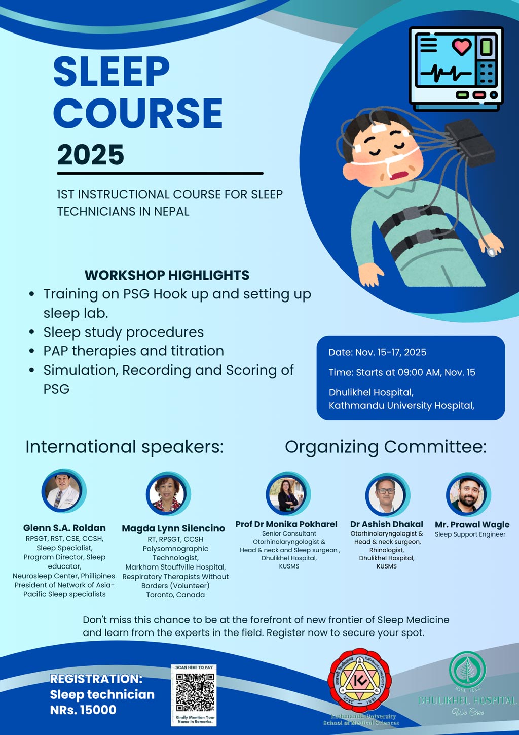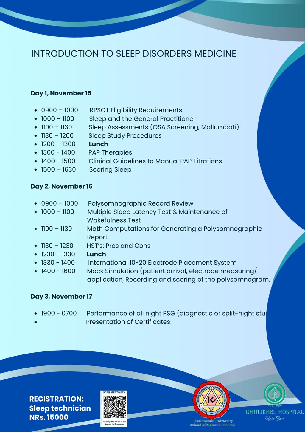 Sleep Course 2025 + Add to Google Calendar + iCal / Outlook export Date Nov 15 - 17 2025 Time 9:00 am - 4:00 pm Organizer Dhulikhel Hospital Phone 011-4904947 Email direct@dhulikhelhospital.org Website https://dhulikhelhospital.org Share this event