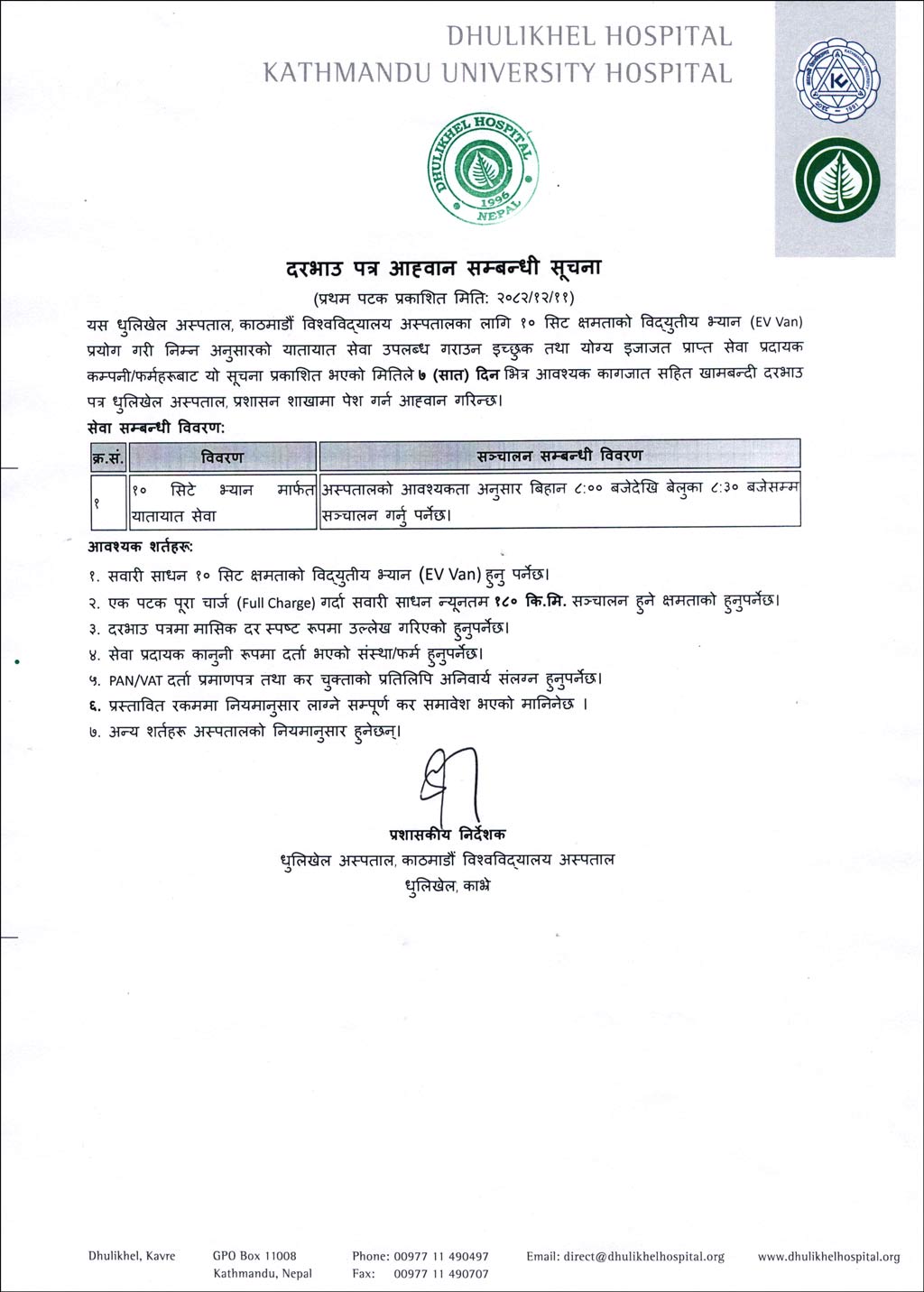 बिदुयुतीय भ्यान (EV Van) १० सिट प्रयोगको लागि दरभाउ पत्र आव्हान सम्बन्धी सूचना