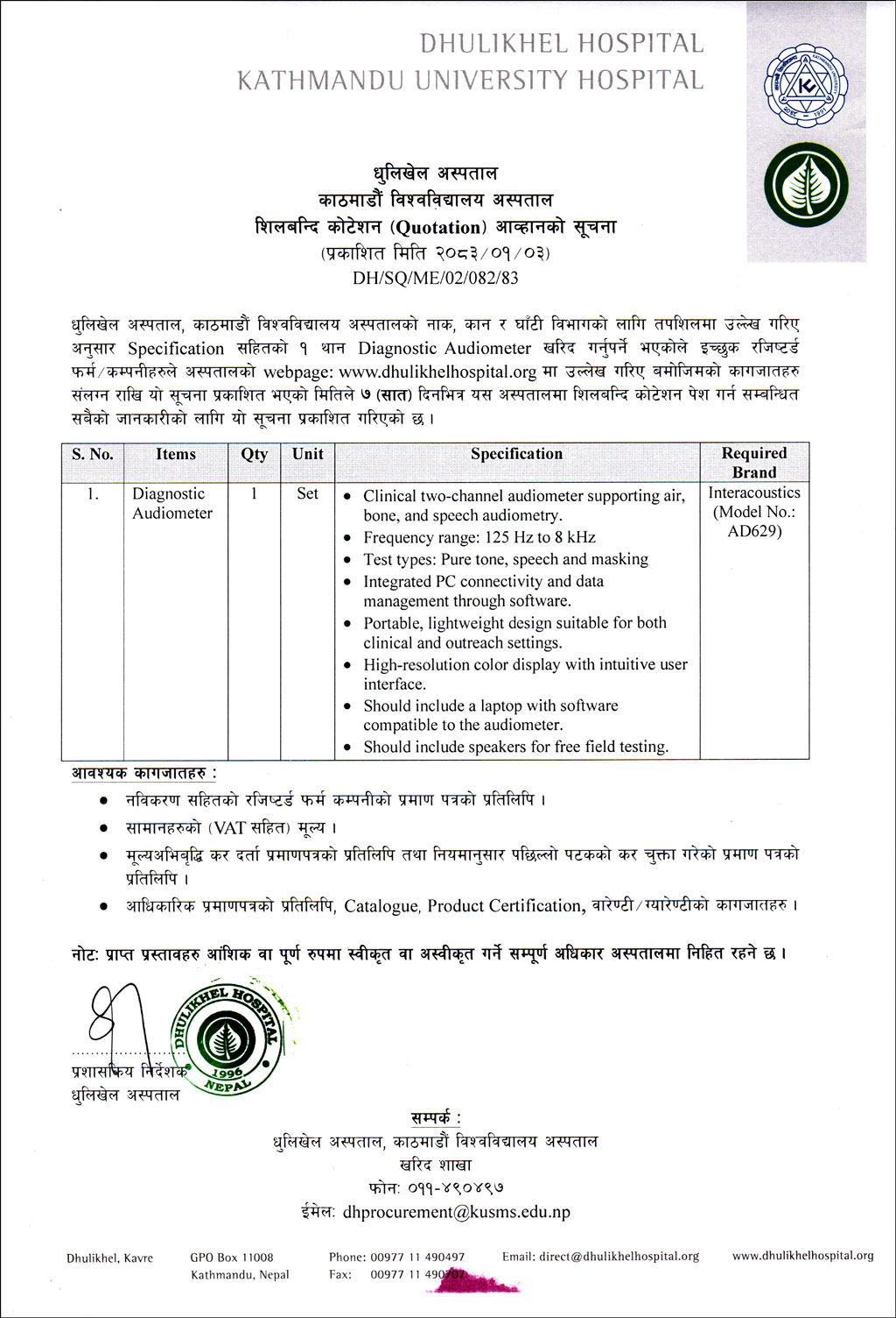 Diagnostic Audiometer खरिदका लागि शिलबन्दी कोटेशन आव्हानको सूचना