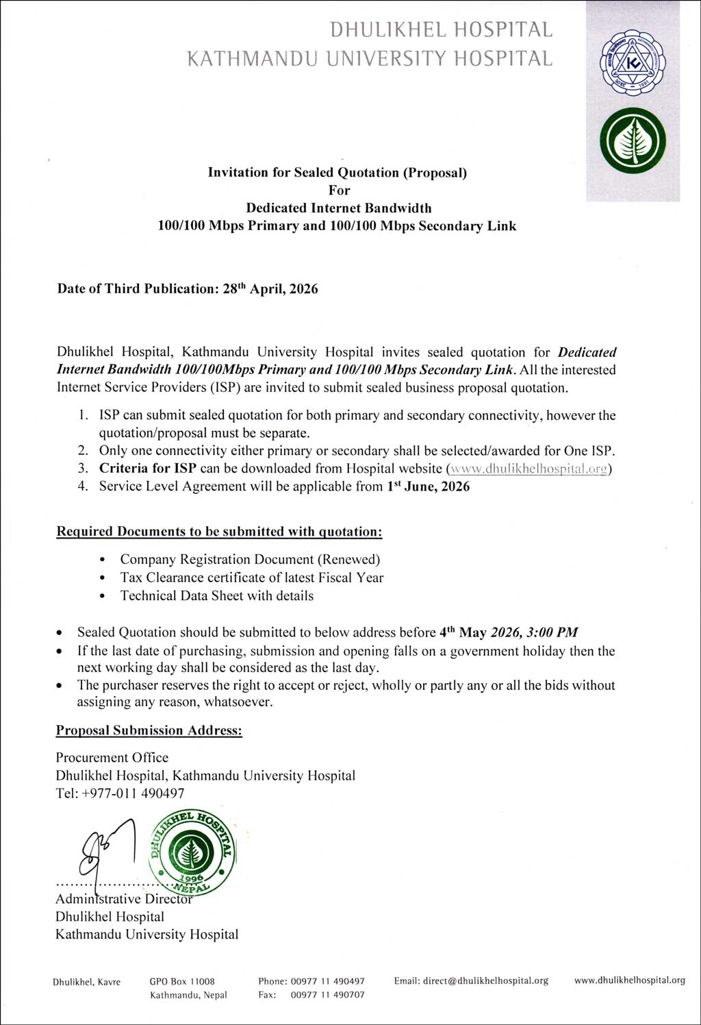 Invitation For Sealed Quotation For 100/100 Mbps Primary And 100/100 Mbps Secondary Link- Second Publication