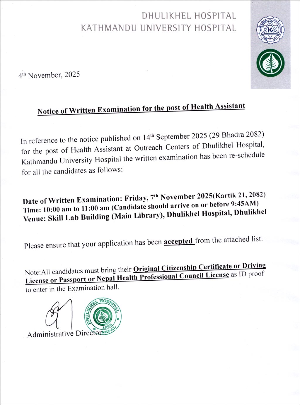 Notice Of Postponed Of Written Examination For Health Assistant Position