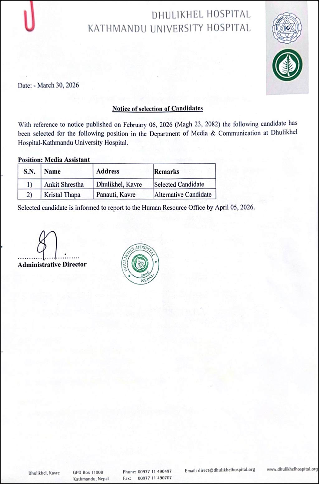 Selected Candidate For The Post Of Media Assistant