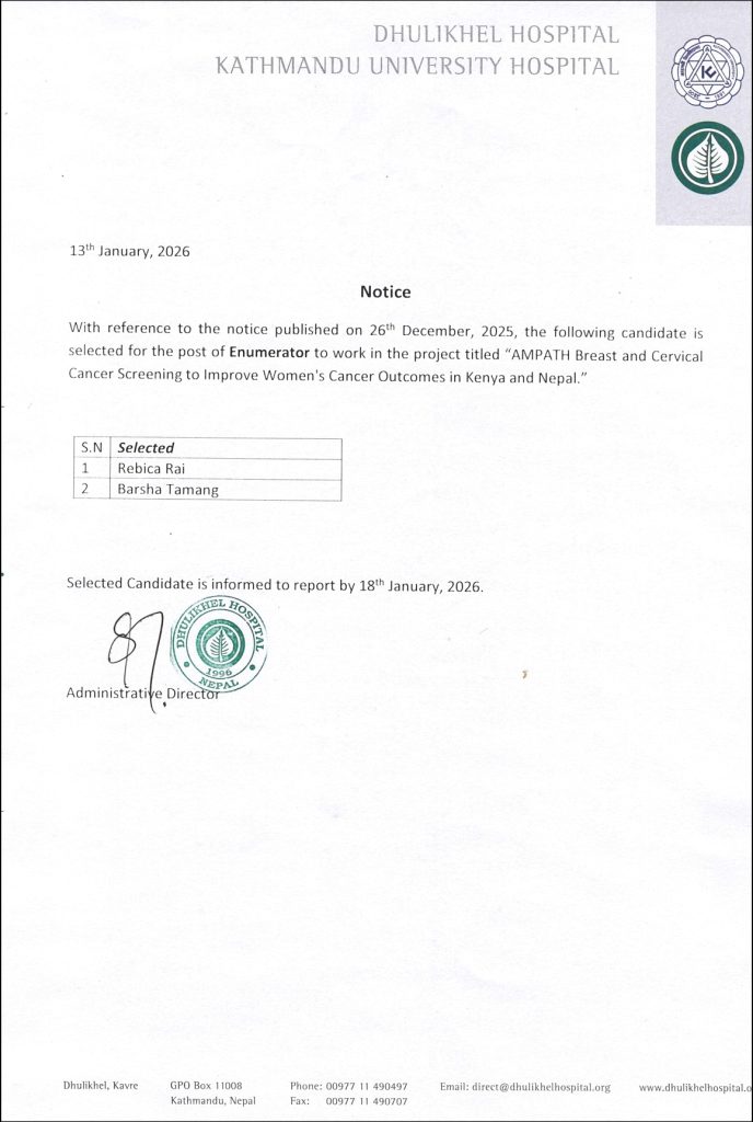 Selected Candidates For The Post Of Staff Nurse -Outreach Centers/Dolakha Hospital