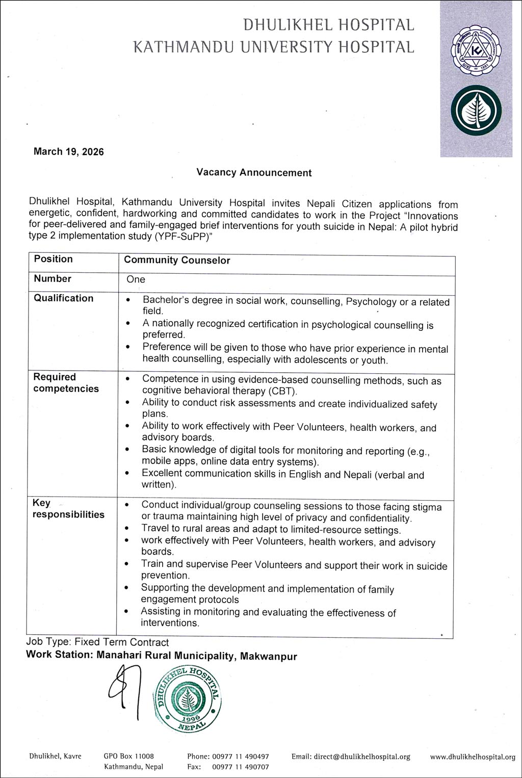 Vacancy Announcement For The Post Of Community Counselor
