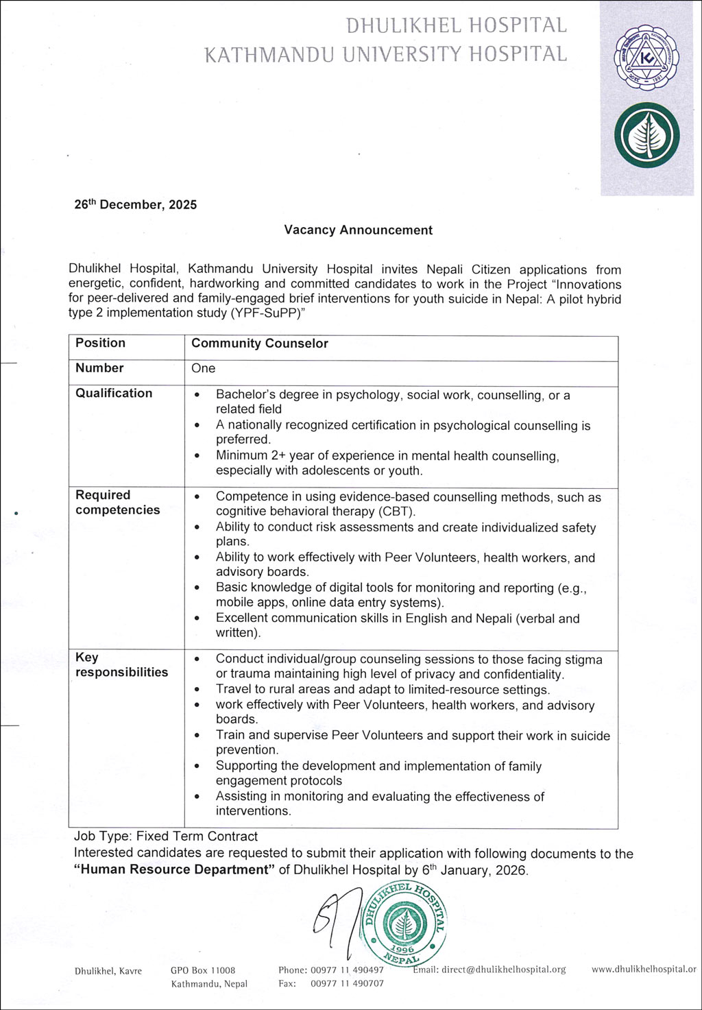 Vacancy Announcement For The Post Of Community Counselor