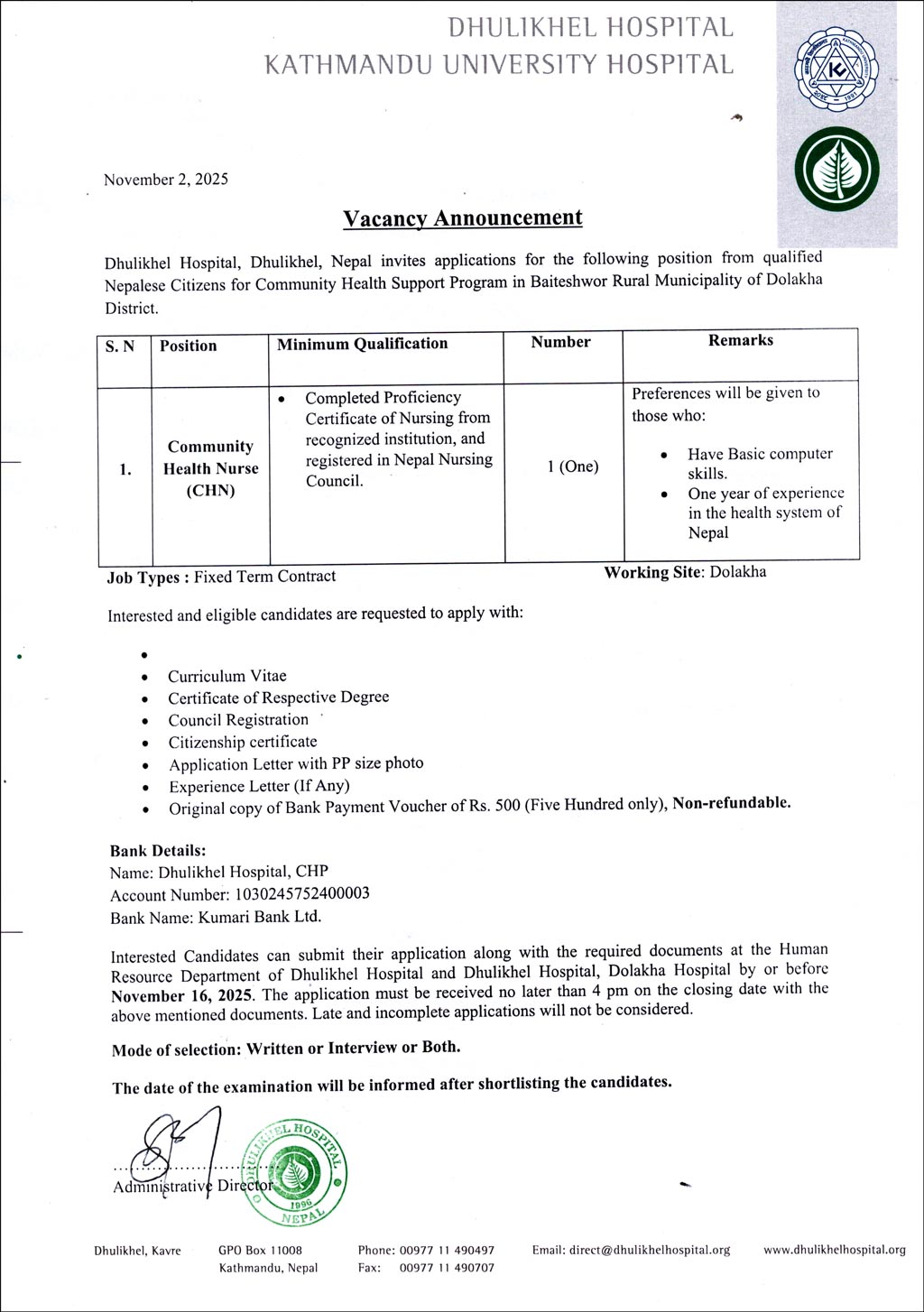 Vacancy Announcement For The Post Of Community Health Nurse (CHN)