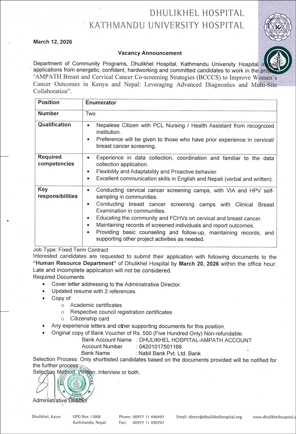 Vacancy Announcement For The Post Of Radiographer, Ophthalmic Assistant And Lab Technician