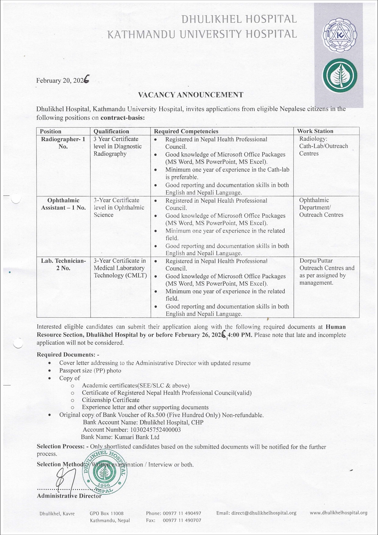 Vacancy Announcement For The Post Of Radiographer, Ophthalmic Assistant And Lab Technician