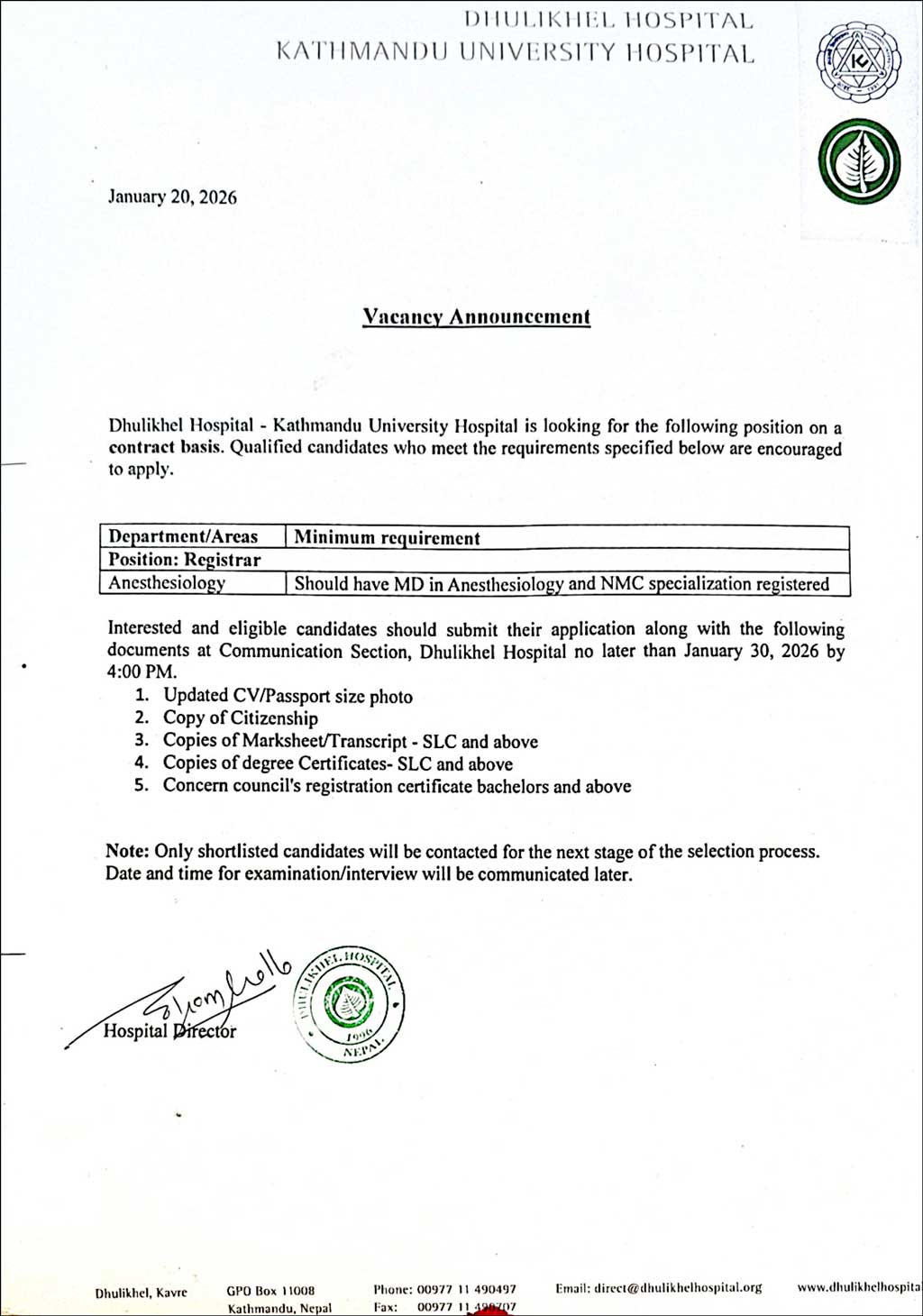 Vacancy Announcement For The Post Of Registrar in Anesthesiology Department