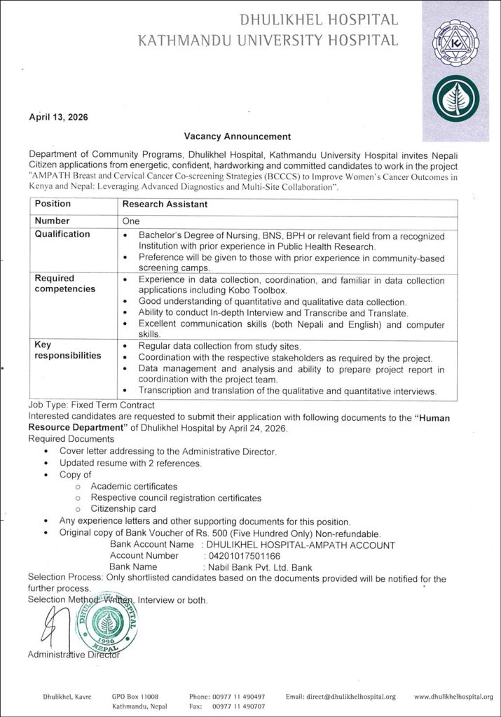 Vacancy Announcement For The Post Of Research Staff Nurse