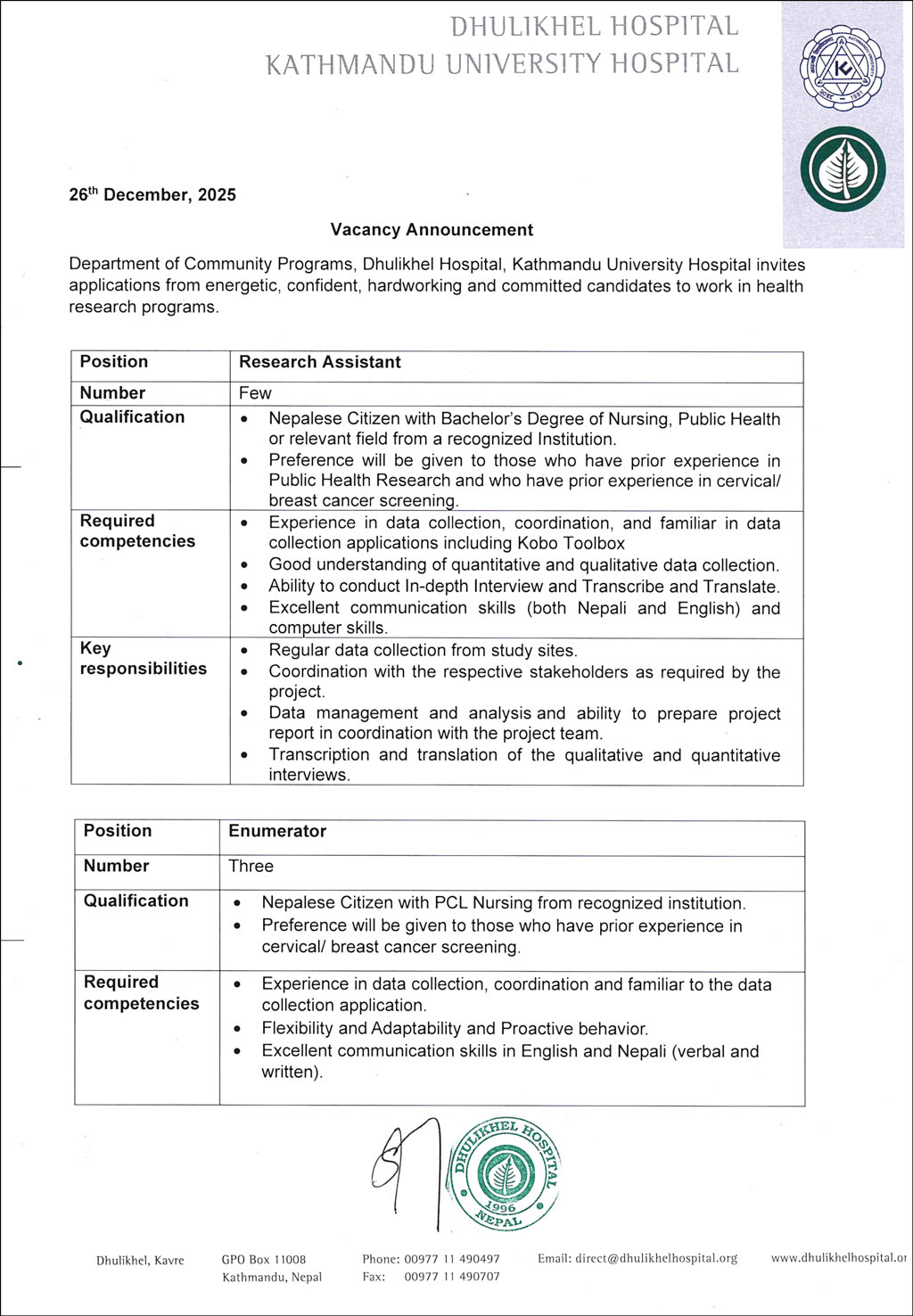 Vacancy Announcement For The Post Of Research Assistant and Enumerator